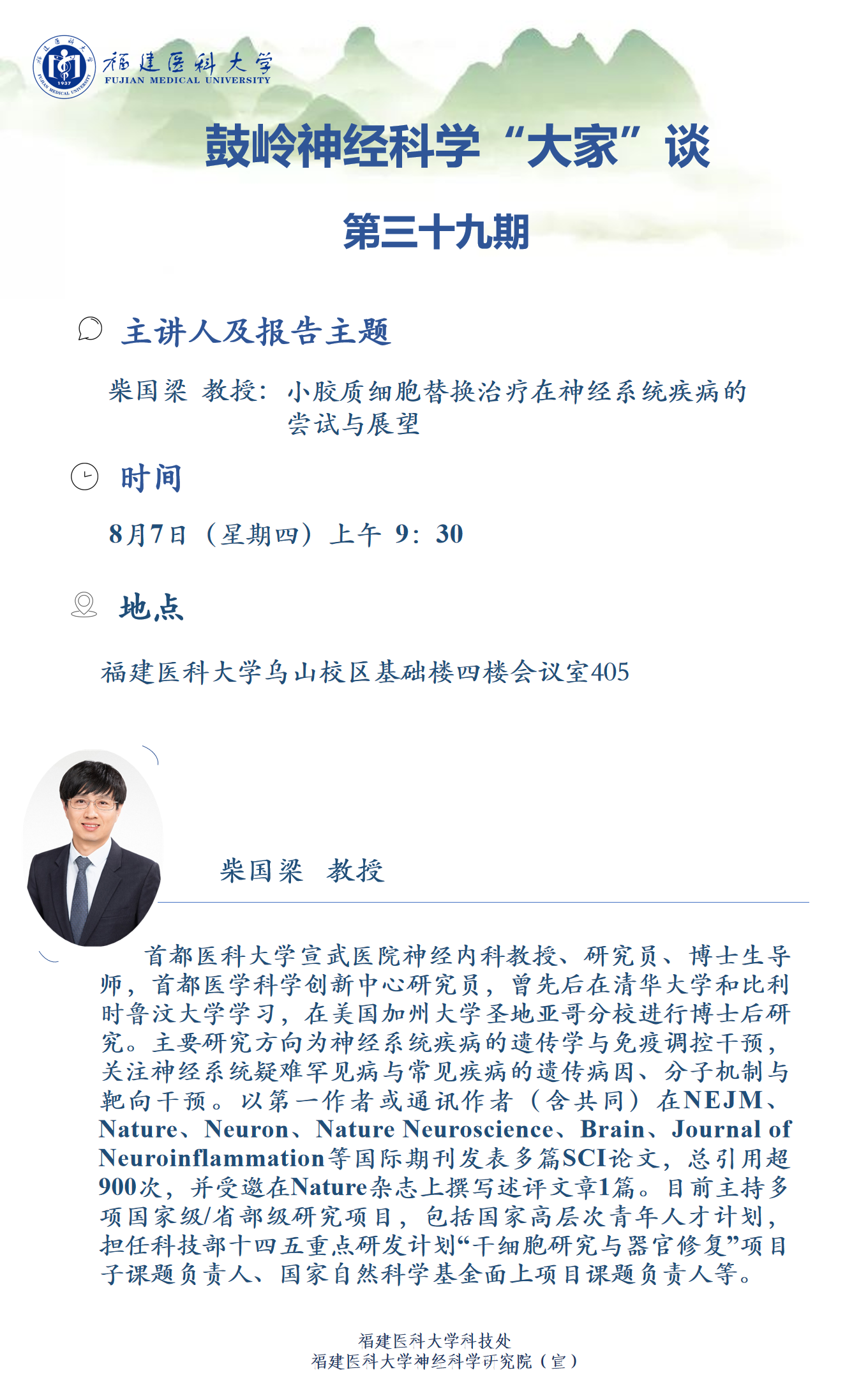柴国梁,首都医科大学宣武医院神经内科教授、研究员、博士生导师,首都医学科学创新中心研究员,曾先后在清华大学和比利时鲁汶大学学习,在美国加州大学圣地亚哥分校进行博士后研究。主要研究方向为神经系统疾病的遗传学与免疫调控干预,关注神经系统疑难罕见病与常见疾病的遗传病因、分子机制与靶向干预。以第一作者或通讯作者(含共同)在NEJM、Nature、Neuron、Nature Neuroscience、Brain、Journal of Neuroinflammation等国际期刊发表多篇SCI论文,总引用超900次,并受邀在Nature杂志上撰写述评文章1篇。目前主持多项国家级/省部级研究项目,包括国家高层次青年人才计划,担任科技部十四五重点研发计划“干细胞研究与器官修复”项目子课题负责人、国家自然科学基金面上项目课题负责人等。